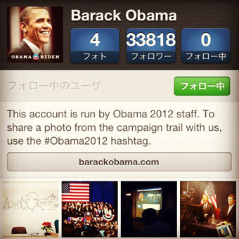 アカウントには「This account is run by Obama 2012 staff.」(このアカウントはオバマのスタッフがやってますよ)と説明書きがあります。この文言は、オバマ大統領のTwitterにも同様に記載されており、Twitter、Instagram共、バラク・オバマ陣営がPR活動の一環として運営ということなんでしょうね。